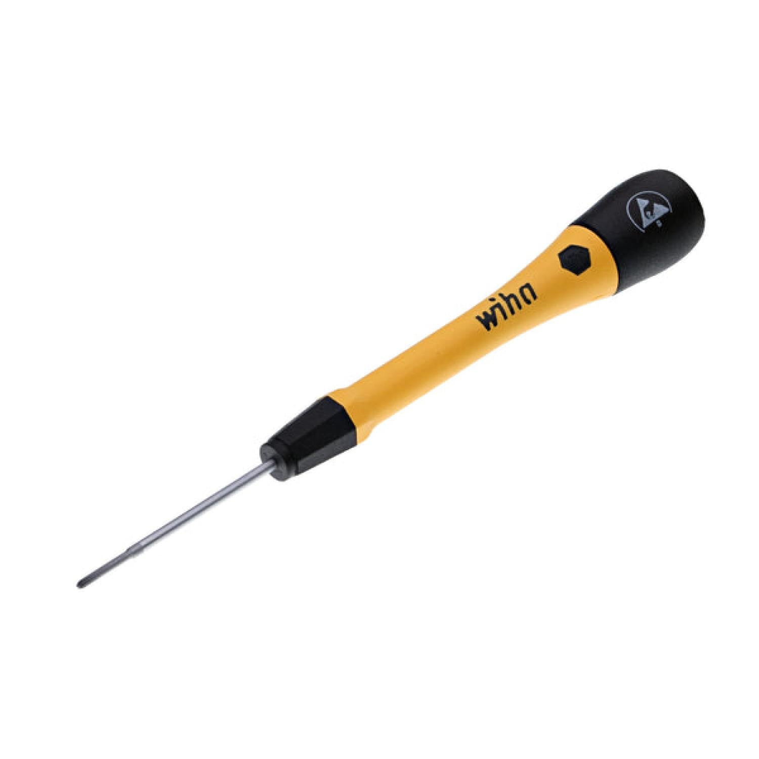 Wiha ESD Safe PicoFinish® Precision Drivers are the standard for premium quality featuring ergonomic cushion grip handles for comfort and control, dual durometer construction for long-lasting durability, and handles directly molded to the blade for a permanent bond. The PicoFinish® style includes a hex profile finger grip for precise torque and control, a tapered handle for rapid rotation, and an extra-long cap for optimal hand positions and smooth turning. The handles are sized proportionately to the blade for consistent mechanical advantage and have driver tip profiles labeled on the cap for easy identification. Wiha ESD Safe PicoFinish® Precision Drivers consist of Wiha premium quality tool steel engineered for strength and durability, have a chrome-plated satin finish for corrosion protection, and feature exact fit precision machined tips for reduced cam-out. Wiha ESD safe precision tools meet ESD Standard IEC 61340-5-1 for protecting electronic devices from electrostatic discharge and have a handle surface resistance of 106 - 109 Ohms for balanced electrostatic dissipation. Wiha premium quality ESD Safe PicoFinish® Precision Drivers are designed and engineered by Wiha Germany and manufactured in Germany. You can invest with confidence knowing that this product is backed by the Wiha No Hassle Guarantee.