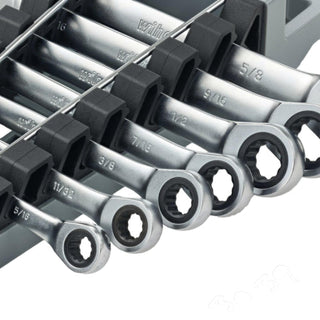 Wiha's Combination Ratchet Wrenches feature 72 tooth ratcheting system with a 5° arch swing for fastener applications with limited wrench clearance and the 12-point box-end allows for compatibility with hex, double-hex, and square head nuts and bolts. The open end is angled to 15 degrees for flexibility in limited space environments allowing you to flip the wrench with each rotation to tighten or loosen the fastener efficiently. Wiha Wrenches are engineered using premium-quality tool steel, through-hardened for wear resistance, have a Satin finish for corrosion protection, and the size profiles are boldly stamped on the handle for easy identification. The tools come conveniently stored in a soft grip rack for secure, space-saving storage. Wiha Combination Ratchet Wrench Sets are backed by the Wiha No Hassle Guarantee.