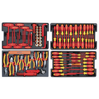 Insulated 112 Piece Tool set with Screwdrivers, Nut Drivers, Pliers, Cutters, Ruller, Adjustable Wrench, Knife, Wire Strippers, T-Handles, Voltage Detector, Sockets, and Wrenches sizes 1/4 to 1-1/4 SAE and 8 to 32 Metric in 22"L x 13 3/4"W x 9"H rolling tool case. This extensive kit will give electricians's the comfort of knowing they are equipped with every tool they need to get the job done. The set contains common tools for electricians like Screwdrivers, Nut Drivers, Pliers and Cutters, Adjustable Wrench, Wire Strippers, Knife for wire stripping, Folding Ruler, Voltage Detector, T-handles, Wrenches, and Sockets for everyday work. All of the tools come conveniently stored in large heavy duty rolling case. The tools are stored in removable insert trays, keeping the tools organized and secure during transport. This case will make transporting tools from each jobsite much easier and faster. The case is equipped with a large storage space which offers ample space for more equipment to be carried. Every single Wiha insulated tool is individually tested to 10,000 volts AC and rated to 1,000 volts AC (1,500 volts DC) for safety and peace of mind in energized applications. This tool is VDE Certified and meets EN/IEC 60900 testing standards for protection against arc flash explosion, ASTM F1505 standard specifications for insulated and insulating hand tools and CSA testing benchmarks for safety and performance.