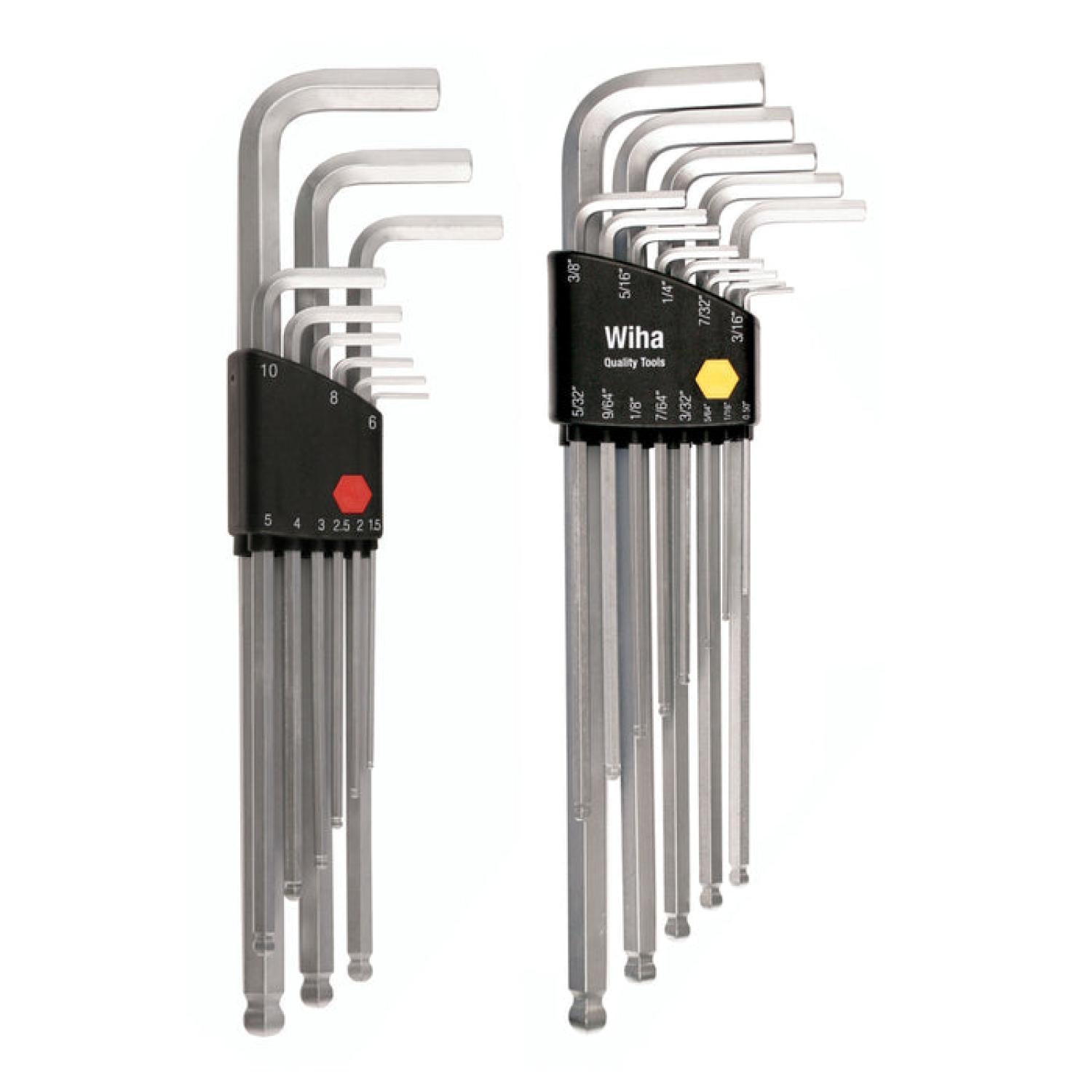 22 Piece Ball End Hex L-Key Set - Inch - Metric Set Includes: 1.5, 2.0, 3.0, 4.0, 5.0, 6.0, 8.0, 10.0mm | .050, 1/8, 9/64, 5/32, 3/16, 7/32, 1/4, 5/16, 3/8, 1/16, 5/64, 3/32, 7/64" | Holder 13 Piece Inch Hex Key Black | Holder 9 Piece Metric Hex Black Extra Long metric ball End L-keys sets Wiha Exclusive Chrome-V-Moly Super Tool Steel Ball Ends for up to 25° off center access fastening Through Hardened for maximum durability.