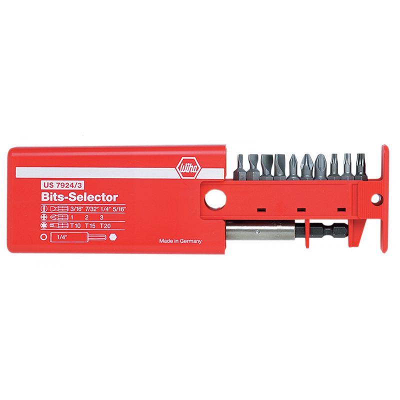12 Piece Bits-Selector and Magnetic Bit Holder Set Industrial Quality through hardened bits Pocket Sized box with slide out drawer, keeps bits organized Dimensions: Length-4.25" Height-2.0" Deep-.75" All Sets Include 1/4 Magnetic bit holder for power tool use Guaranteed Quality Bits - Made by Wiha.