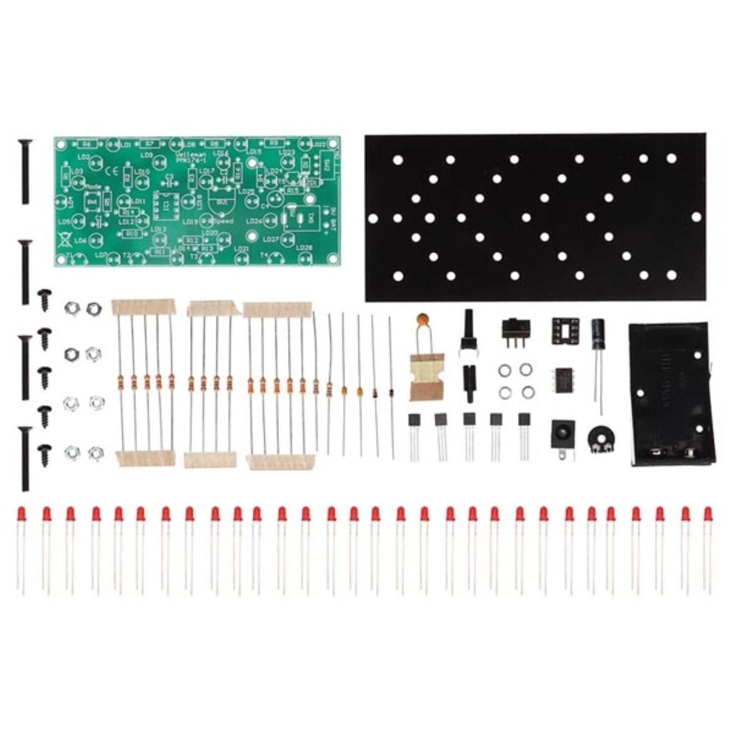 Use these animated beams as a directional or advertising aid, or as a simple eye-catcher. Choose from 10 effects (rolling, scrolling, reverse scrolling, flashing, partial flashing, etc.) and select the desired speed. The last animation used is memorized. Featuring an on/off switch, this educational soldering kit operates with an adapter (not supplied) or a 9V battery (not supplied).Use these animated beams as a directional or advertising aid, or as a simple eye-catcher. Choose from 10 effects (rolling, scrolling, reverse scrolling, flashing, partial flashing, etc.) and select the desired speed. The last animation used is memorized. Featuring an on/off switch, this educational soldering kit operates with an adapter (not supplied) or a 9V battery (not supplied).